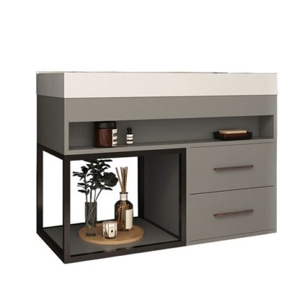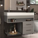 O diferencial deste Gabinete de Banheiro é a cuba em marmorite resinado com um desenho moderno e ainda tem como charme o seu nicho com estrutura metálica. Imagem meramente ilustrativa. Decoração não acompanha o produto. O produto será entregue parcialmente montado, sendo necessário apenas a instalação dos puxadores sendo de fácil manuseio. Acompanha manual de instalação do Conjunto de Banheiro para melhor orientação. Produto NOVO – acompanha nota fiscal, manual de montagem e certificado de garantia.